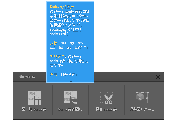 ShoeBox软件提供图形化界面,即使不懂脚本编程的用户也能轻松制作复杂的Sprite表和位图字体。