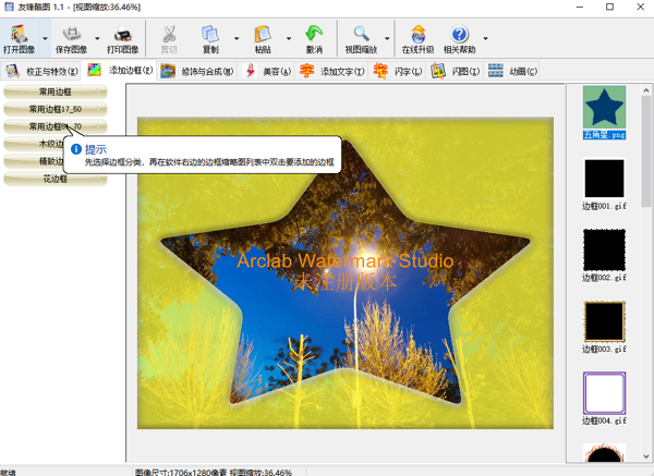 软件预置了大量的一键式特效,包括艺术滤镜、风格化效果、光影特效等。同时提供了丰富的相框、装饰素材以及带有大量预设样式的文字特效(艺术字、特效字)。