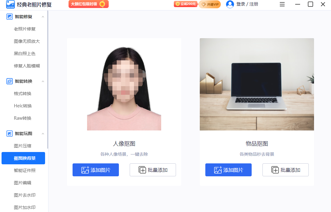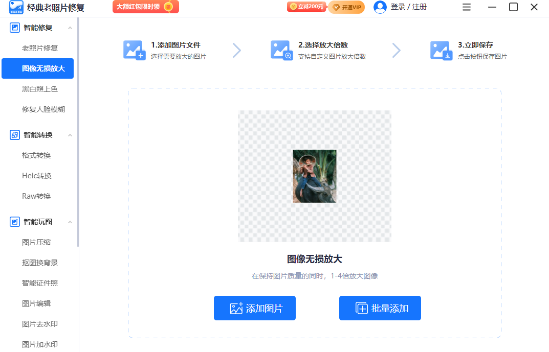 经典老照片修复是一款非常强大的照片修复工具,经典老照片修复软件之中用户可以使用该软件之中的AI功能快速对老照片、破碎的照片进行修复,可以对低画质、黑白颜色、照片小等等照片进行内容的修复、扩大以及提高清晰度,让老照片可以复原。