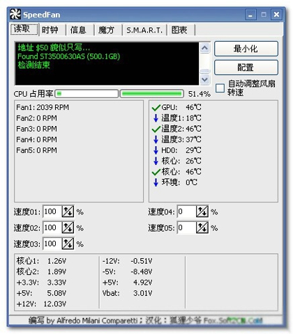 SpeedFan中文你版是一款功能强大且免费的硬件监测和控制工具,软件能够让用户了解计算机硬件的温度、风扇转速和电压等,SpeedFan电脑版2025可以通过实时显示硬件的运行状态,能够通过控制风扇转速来调节温度,让硬件保在一个相对低温的状态。
