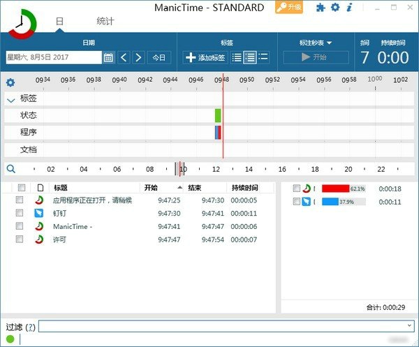 提供应用、文档、标签、网页四大时间线视图,以彩色区块直观展示全天时间分配;