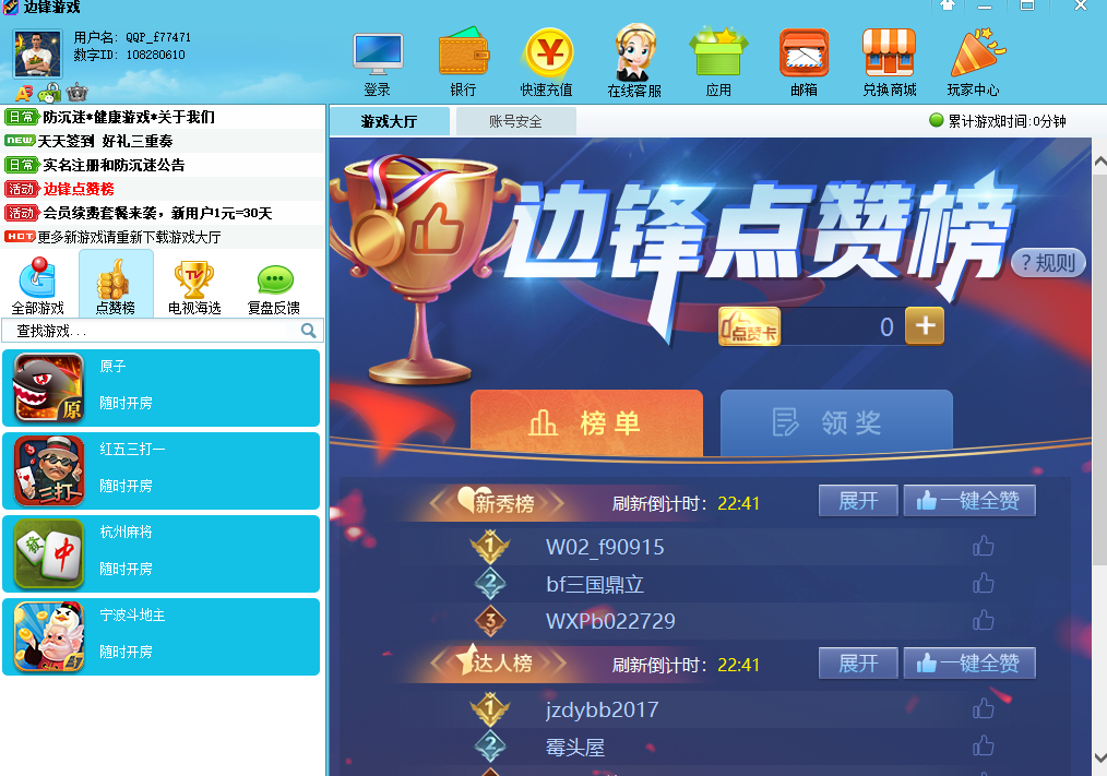 边锋游戏大厅是一款非常不错的棋牌游戏平台,边锋游戏大厅之中用户可以根据自己的喜好来参加各种棋牌游戏,该软件的游戏类型非常多,全国各地的玩法基本都包含,并且定期还有着各种比赛可以参加,让线上游玩转移到线下PK。