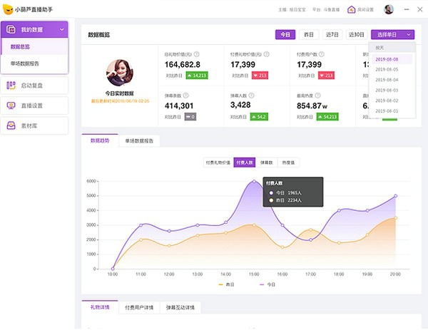 小葫芦直播助手客户端提供精准的直播数据分析,帮助主播分析直播表现和观众行为,进而优化直播内容和运营策略,提升直播效果。
