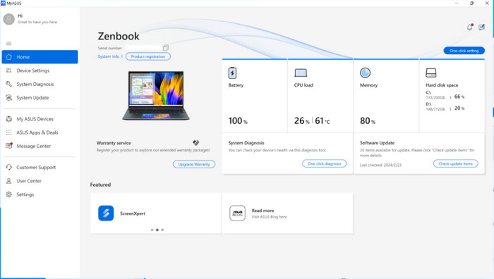 华硕管家 MyASUS 的主页界面简洁直观,集中展示了其核心功能。在这里,您能轻松找到各类关键操作入口,只需轻点相应按钮,便能迅速进入对应页面,进行更深入的设置或查看详细信息。比如,若您想了解电脑的整体运行状况,点击 “一键诊断”,系统便会即刻启动全面诊断程序,快速检测硬件与软件的健康状态;若您考虑为电脑延长保修期限,点击 “保修升级服务”,即可跳转至延保服务选购页面,便捷完成服务选购。