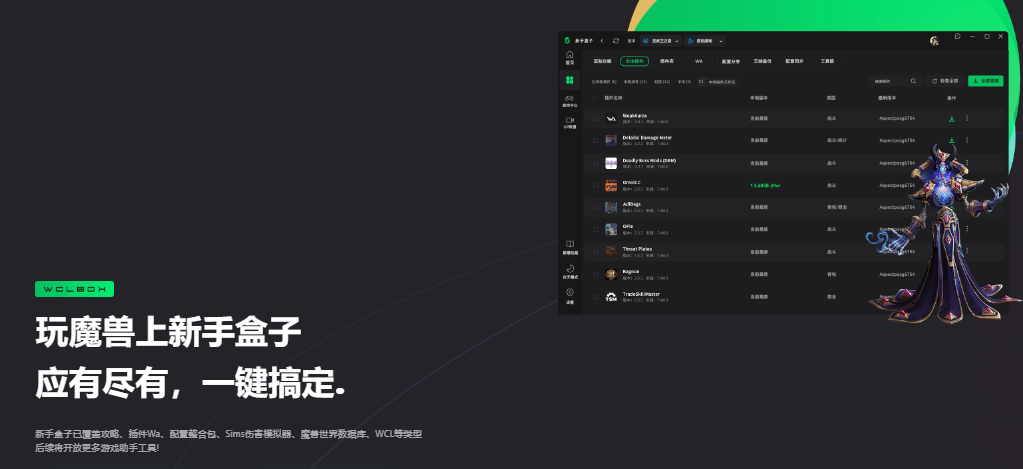 魔兽新手盒子是一款专注于魔兽世界游戏内容的插件软件,wow新手盒子最新版之中用户可以直接在这里安装各种游戏插件,这些插件可以让游戏变得更加简便,祛除了不少妨碍用户操作的特性,让新手可以更快的适应好游戏环境。