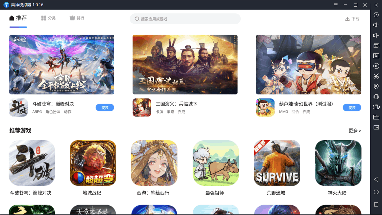 雷神模拟器是一款好用的电脑手机模拟器,我们可以直接在电脑上使用手机软件,在该软件上直接安装各类手机应用app,可以完成办公需求,也可以在这里玩各种手机游戏,体验电脑端玩手机游戏的大屏幕快乐。