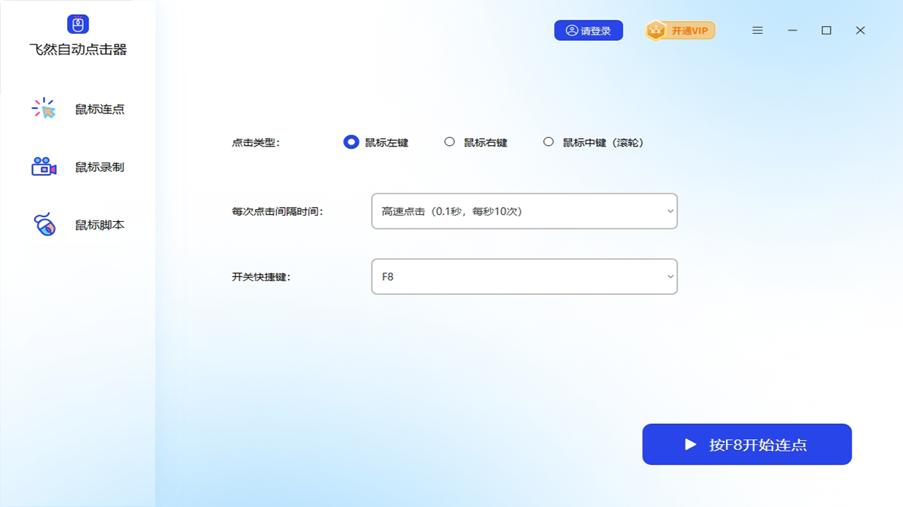 飞然自动点击器是一款好用的鼠标连点器,飞然自动点击器最新版之中用户可以使用该软件用鼠标快速的点击,在这里可以设置好各种鼠标的点击模式,只要设置好鼠标的各个格式,点击开始就可以根据设置的鼠标格式来快速进行点击。