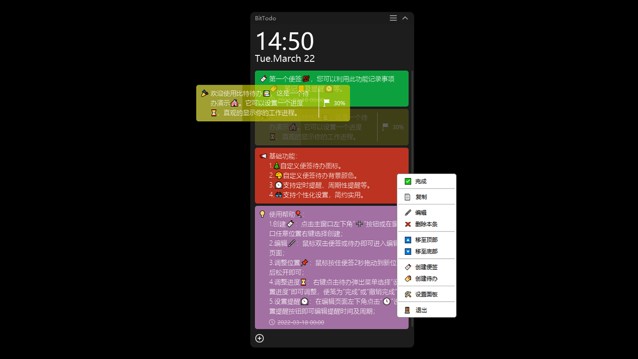 比特待办是一款好用的便签软件,比特待办之中用户可以直接使用该软件来进行各种便签的记录,该软件有着非常明晰的事件安排记录,使用大红大绿的便签配色,快速吸引用户的眼球,让用户注意到该时间距离办事的时间很紧张了。
