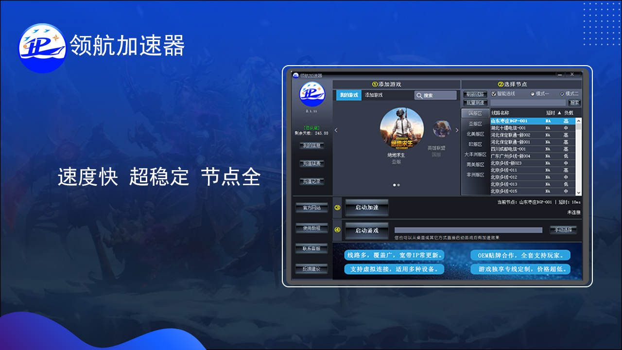 领航加速器是一款专注于游戏使用的加速器软件,领航加速器最新版之中用户可以直接通过该加速器登录到各大平台以及游戏之中,在这里金融级别稳定速度可以保证用户在游玩的时候不会因为网速波动而导致的卡顿丢包,以此来提升用户的游戏体验。