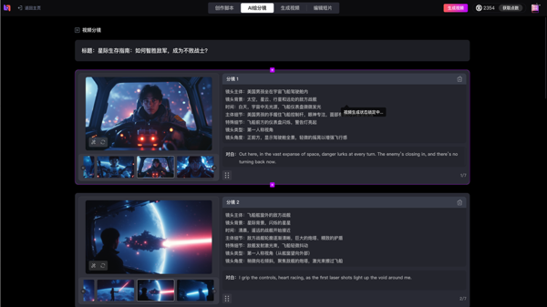 剧本内容丰富,情节起承转合自然流畅,角色设定鲜明生动。随即,系统进一步将剧本拆解为细致入微的分镜头脚本,从场景布置、角色走位到运镜方式,每一个细节都精心设计,为后续的视频制作筑牢根基。