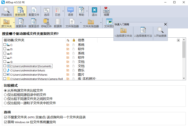 Alldup免费版是一款功能强大的重复文件查询工具,Alldup绿色版PC端可以帮助用户检测和移除计算机中的重复文件,支持按文件名、文件大小、文件内容等多种方式查找重复文件,轻松释放更多的存储空间,多种扫描排列方式可以自由选择。