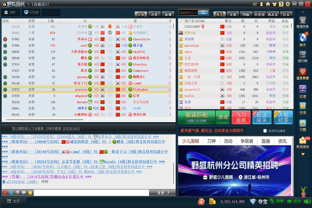 野狐围棋是一款非常好玩的围棋对战平台,野狐围棋正版之中用户可以使用该软件进行围棋对弈,该软件可以选择和玩家进行对战,也可以选择和电脑进行练习,在这里可以围观高手之间的对决,还有不少职业选手在其中对战,只要你强就能碰到哦。