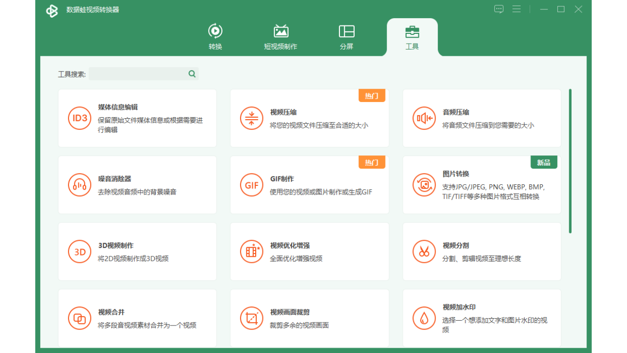 软件集多种音视频处理功能于一身。能转换常见与小众视频、音频格式,还可提取音频、压缩视频、合并 / 分割视频、添加水印、分屏、消噪、转化图片、转 gif,全方位满足各类创作与使用需求。