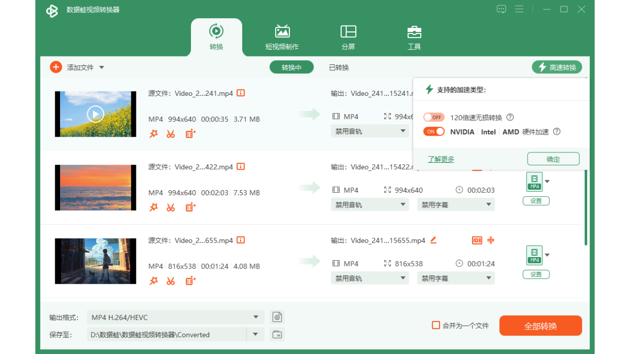 数据蛙视频转换器的转换速度非常快,在转换的时候用户无需等待,可以自己去做其他事,等待其完成会自动进行提醒,并且转换后的文件会自动进行排序和文件排列。