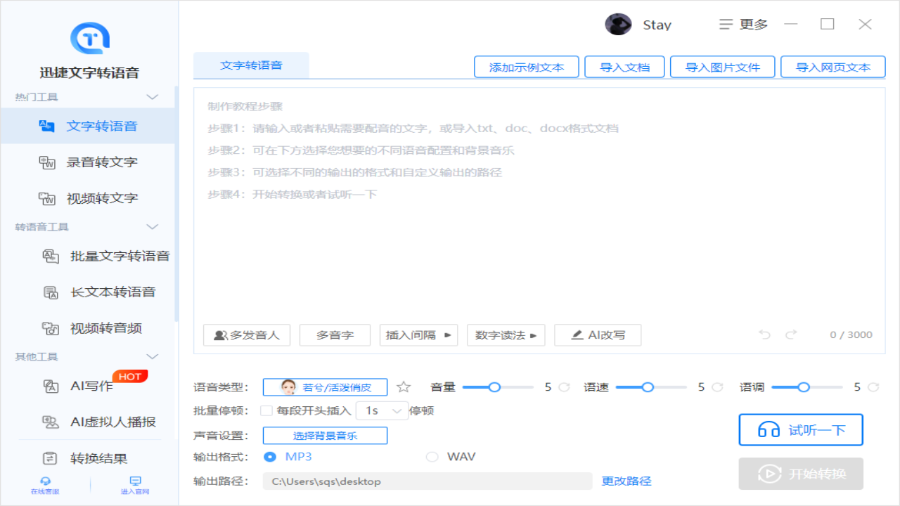 迅捷文字转语音之中用户可以使用该软件进行各种语音的转换,该软件有着非常多的语音模型,用户可以选择一个就可以直接进行语音播放,导出的文件格式也有多种,基本可以满足好用户的需求。