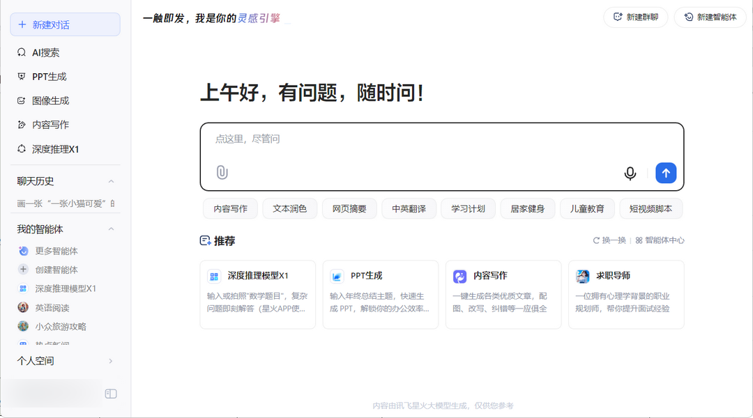 讯飞星火AI是科大讯飞推出的AI智能大模型,迅飞星火电脑版之中用户可以在软件之中进行各种提问,和AI进行交互对话,该软件支持文本、语音、图像联动的交互模式,可以在生活工作之中帮助用户进行各种物品查询或者问题的解决方案。