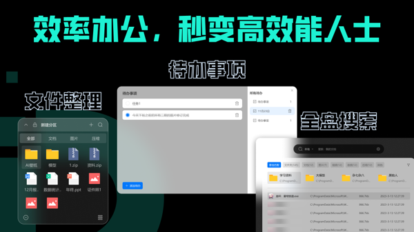 支持桌面图标批量收纳,解决图标杂乱难题,同时具备文件整理和精准搜索功能,快速定位所需文件,告别桌面混乱。