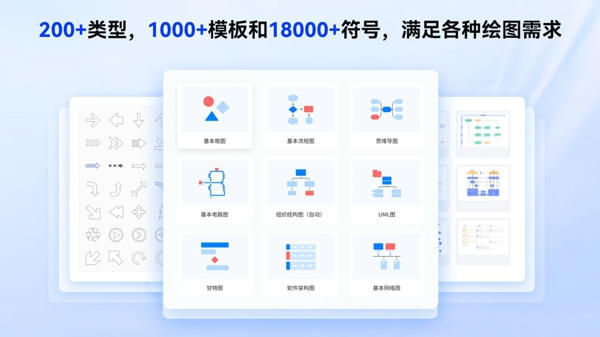 万兴图示软件支持创建流程图、思维导图、组织结构图、网络图、 UML图、工程图、科学图表等多种类型的图示。