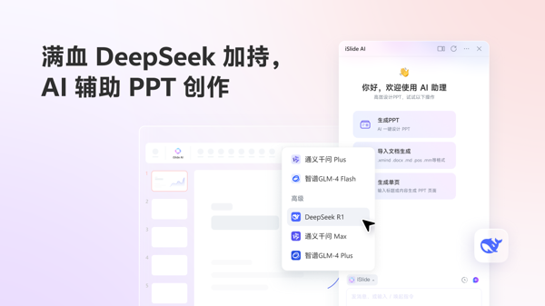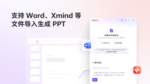 AI 功能贯穿 PPT 制作全链路,输入主题即可一键生成完整大纲与演示文稿,支持 Word、XMind 脑图等 7 种格式文档导入解析,快速输出适配模板的 PPT。