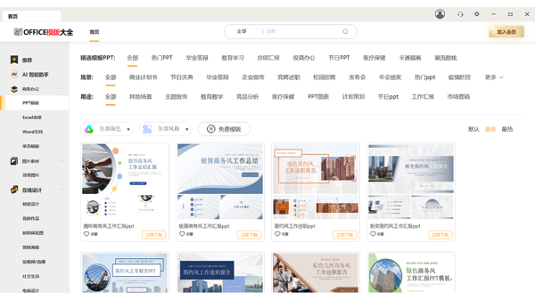 囊括 PPT、Word、Excel 三大核心 Office 软件的模板,PPT 模板涵盖商务汇报、教育课件、科技展会等风格;
