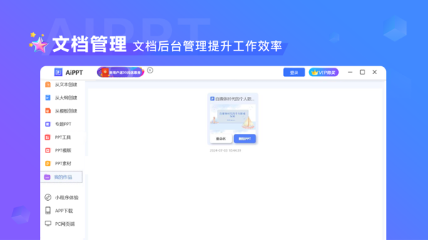 AiPPT专家软件是一款专注于帮助用户创建和设计高质量PPT演示文稿的智能软件,AiPPT专家电脑版提供丰富的模板库,用户可以根据不同主题和风格快速选择适合的PPT模板,支持自动调整排版和布局,能够让演示文稿视觉效果的统一和美观,提升观众的观看体验。