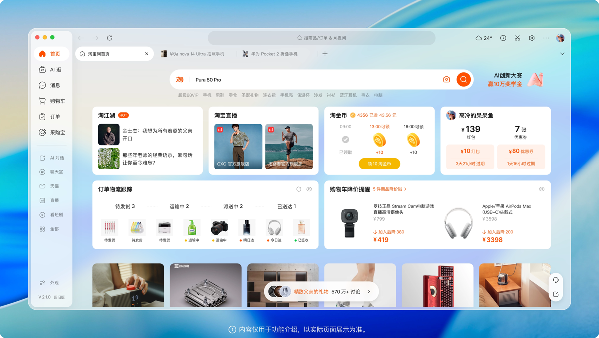 淘宝电脑版涵盖商品搜索、收藏、加购、支付等购物全流程操作,还整合了淘宝直播专区,支持画中画播放,用户可边看主播演示边浏览商品详情。