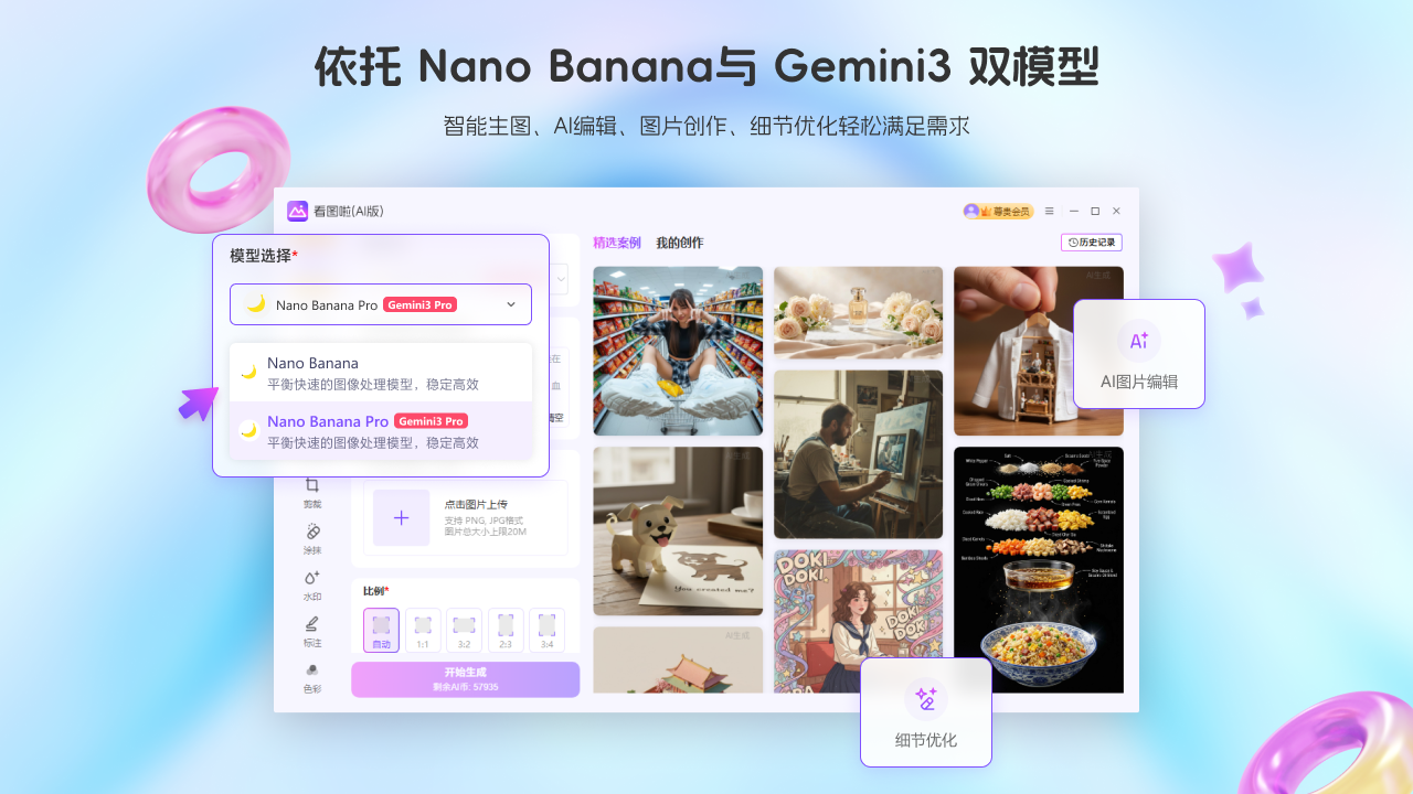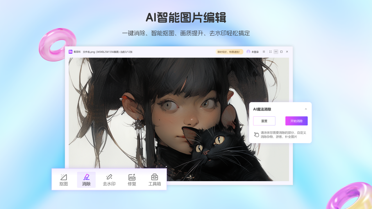 看图啦AI版是一款智能的图像浏览与处理软件,看图啦AI版2026最新客户端提供多种编辑工具,可以轻松调整图像效果,能够高效识别图片中的物体、场景和文字,为用户提供智能标记和快速搜索功能,智能识别图片中多余元素并一键去除,AI去水印则可精准检测水印并消除,轻松还原图片干净原貌。