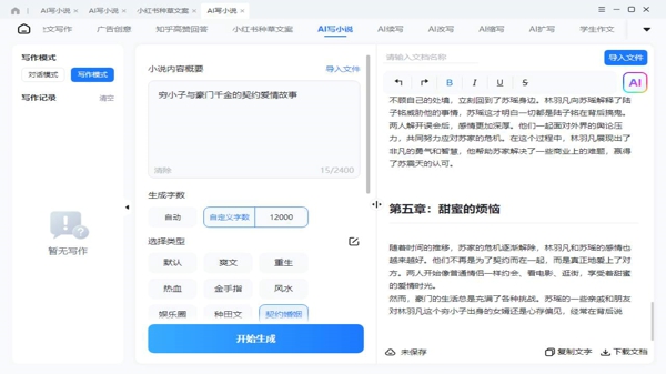 覆盖玄幻、言情、科幻等 20 + 主流题材,内置 “退婚流”“系统文” 等网文热门套路模板,输入核心设定或关键词,即可一键生成完整章节与细纲,5 分钟完成基础创作框架。