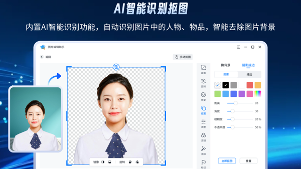 AI 抠图精准到发丝级,自动识别人像、物品边缘,无需手动精细涂抹,抠图后换背景、合成画面自然无痕迹。