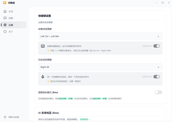 闪电说是一款强大的语音转文字应用,闪电说电脑版能够结合AI功能快速完成语音转文字,提供自动纠错,能够及时识别并纠正用户的语音输入错误,软件会对文字进行润色和补全标点,使输出内容更加流畅自然,能够更高效地完成文档、代码编写和聊天。