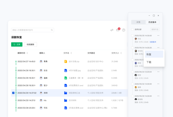 全方位风险防控,文件上传自动云查毒、敏感词识别,高危文件智能隔离,还能抵御勒索病毒,历史版本可回溯。