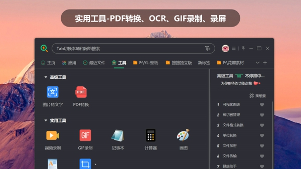 不止文件搜索,还集成 PDF 转 Word、GIF/MP4 录屏、截图标注、图片文字提取等实用工具,一站式解决办公高频需求。