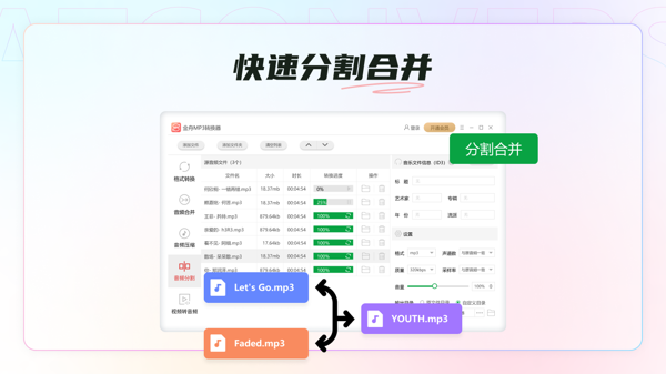 金舟MP3转换器软件提供音频分割与合并功能,可按指定数量或自定义时长分割音频,也能合并多个不同格式音频并统一音量。