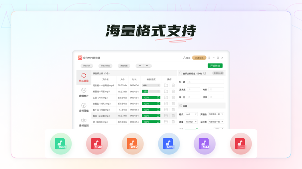 支持 MP3、AAC、M4A、WAV、FLAC、OGG 等 30 + 主流及专业音频格式互转,满足不同设备播放需求。