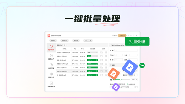 金舟MP3转换器是一款专门用于音频格式转换的软件,金舟MP3转换器2026最新版支持多种常见的音频格式,用户只需导入需要转换的音频文件,选择输出格式,设置输出路径,点击转换按钮即可完成操作,还提供基本的音频编辑功能,进一步满足用户的需求。