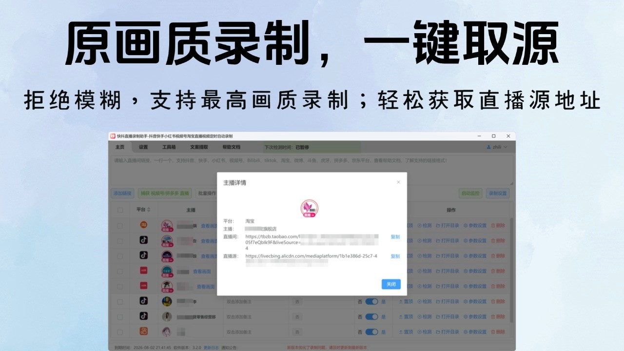 针对视频号无公开链接的特殊情况,设计专属捕获功能,开启功能后搭配 PC 端微信就能自动识别视频号直播画面并录制;抖音等平台还支持通过主播主页链接提前监控,开播自动启动录制。