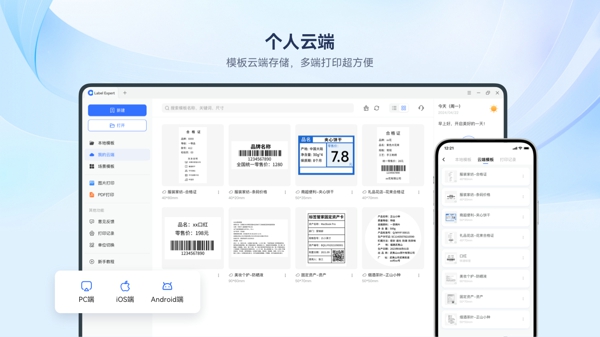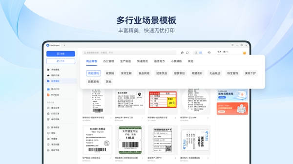 提供海量行业模板库,覆盖快递面单、产品标识、办公文件、安全警示等场景,可直接套用并二次编辑,新手也能快速出图。