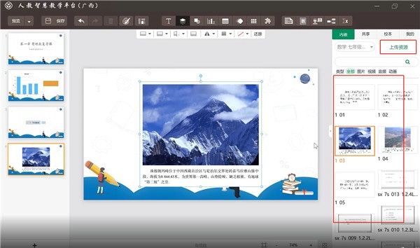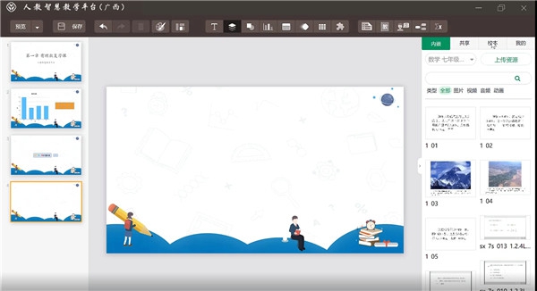 可视化课件编辑工具支持多媒体素材一键插入,搭配海量教案、课件模板,还能组建集体备课空间开展协同创作,备课内容云端同步,PC + 移动端随时随地修改。