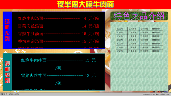 菜谱滚动字幕软件支持纯色、图片替换或透明模式,适配不同桌面或展示场景风格,文本可更换字体、调整字号,支持固定颜色或自动变换颜色,视觉效果更鲜活。