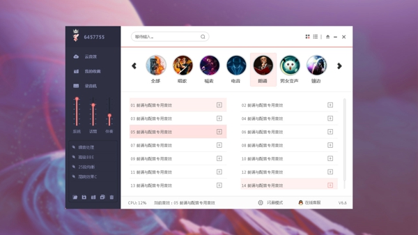 电音精灵软件内置简易调音台,用户可以方便地调节系统音量、麦克风音量和播放器音乐音量,实现精准的音量控制和混音效果。
