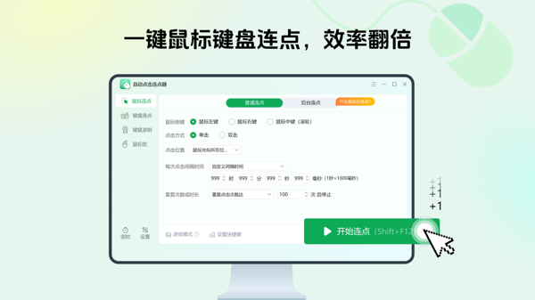 专业极速连点核心,支持鼠标左右键自定义连点,毫秒级调节点击间隔与循环次数,最高实现每秒千次点击,突破手速限制高效完成重复操作