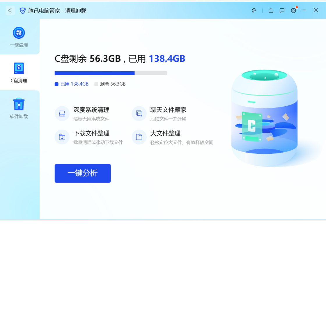 C 盘清理精准到位,扫描缓存、聊天文件、下载文件等,可选择搬家或清理,有效释放 C 盘空间,让系统运行更加流畅。