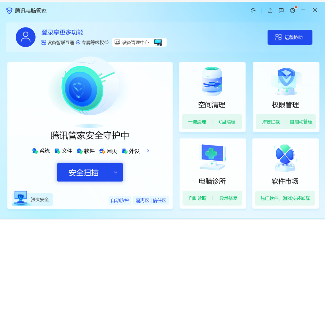 新版电脑管家已支持微信、QQ账号登录(QQ登录需下载管家16.8及以上版本)。微信和QQ账号是两套独立的账号体系,信息资产不互通,登录后可使用的功能与权益是一致的。