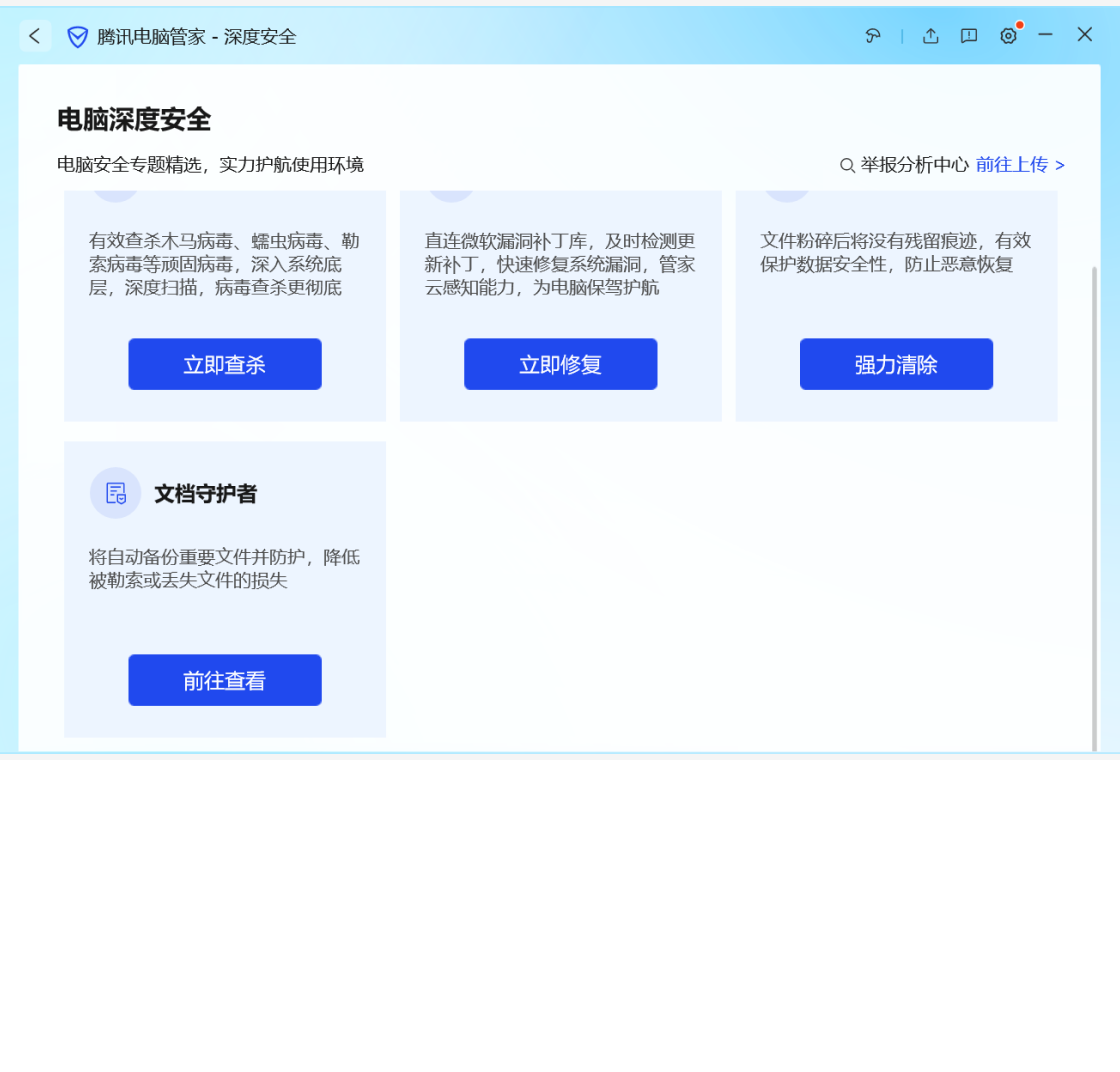 腾讯电脑管家来自腾讯旗下对标奇虎360旗下360安全卫士而打造的一款完全无广告的好用的电脑端安全卫士,腾讯电脑管来自腾讯旗下集成所有反病毒功能和系统防护功能为Windows系统用户提供放心使用环境,强大的C盘清理和系统防护可以让大家系统无忧。
